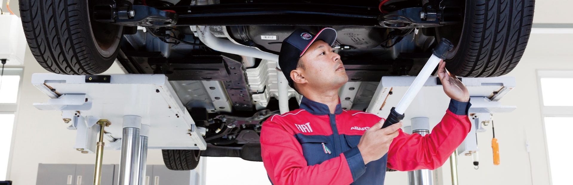 フィアット正規ディーラーのテクニシャンは、FIAT車に特化して技術力を磨いたエキスパート。全ての点検・整備作業で、専用設備と純正パーツを使って最高の品質と技術力をお届けします。
