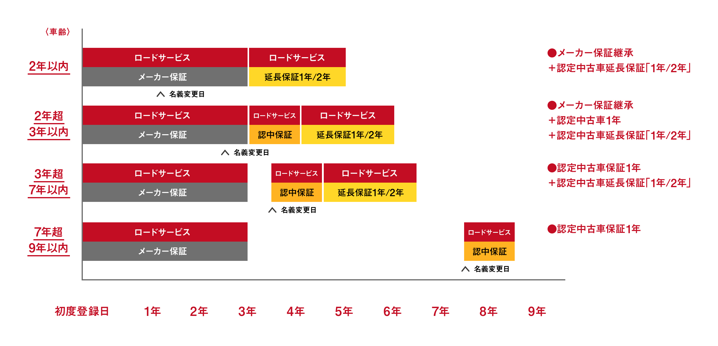 *1 延長保証(有償)と併せての保証期間です。7年超、9年以内の認定中古⾞は延⻑保証の付帯は出来ません。詳しくは正規ディーラーのセールススタッフまでお問い合わせください。
