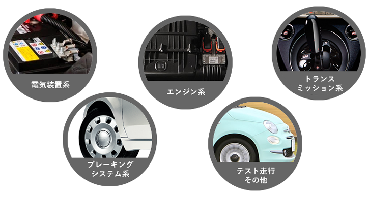 テスト走行・その他系(6項目):走行による総合機能点検、専用テスターによる診断、内外装の点検/クリーニングなどの実施。